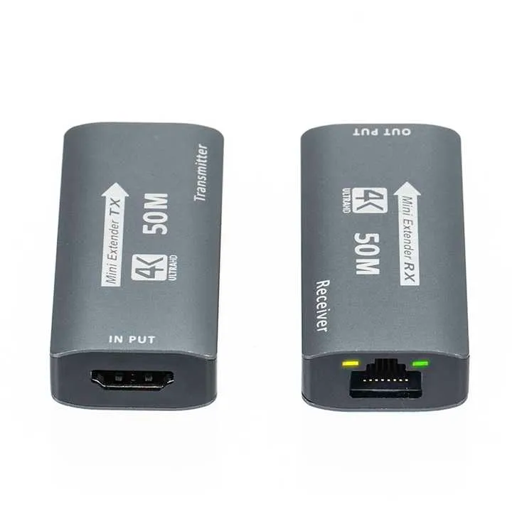 The 50M HDMI 4K Mini Range Extender extends HDMI video and audio up to 50 meters via a single CAT6/CAT6A Ethernet cable without signal loss — ideal for professional AV installations and long‑distance signal routing.